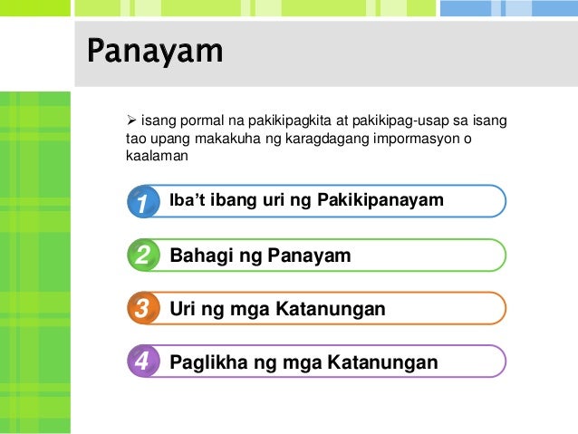 Pagpili ng magbibigay kaalaman 12. Higit pa sa bilang ng mga kalahok din maaari nating ikategorya ang mga uri ng panayam ayon sa kanilang format iyon ay ang paraan kung saan nakikipag-usap ang tagapanayam sa kinakapanayam at tinanong siya ng isang uri ng katanungan o iba pa. Pinakamabilis na uri ng pagbasa na kaya ng tao.