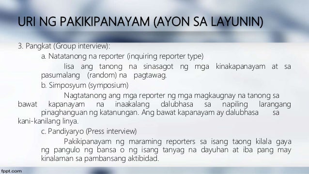 Ayon sa pamamaraan 21. Dalawang Uri ng Pakikipanayam ayon sa Pamamaraan 1. LAYUNIN SA PAKIKIPANAYAM Kumuha ng impormasyon reaksyon ato kurokurong kailangan sa paghahanda ng isang bagay na ilalathala sa pahayagan.
