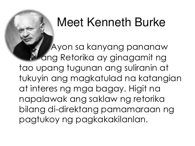 Retorika ayon kay burke 1979. Lubha itong kinakailangan lalo na sa komunikasyong pasalita upang maging kaakit-akit sa. Ang retorika ng Griyego ay karaniwang sinusundan kay Corax ng Syracuse na unang bumuo ng isang hanay ng mga patakaran sa retorika noong ikalimang siglo BC. Ihambing mo ang mga kontemporaryong akda sa mga klasikong akda gamit ang tsart sa ibaba.